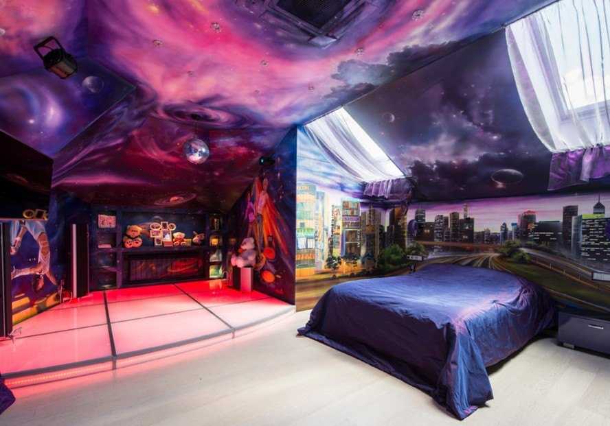 Необычная идея для росписи стен заключается в том, чтобы нанести изображение специальной невидимой флуоресцентной краской. Тогда днем картины не будет видно вообще, а вечером она будет «включаться». Одно из популярных применений невидимых красок — звездное небо на потолке.