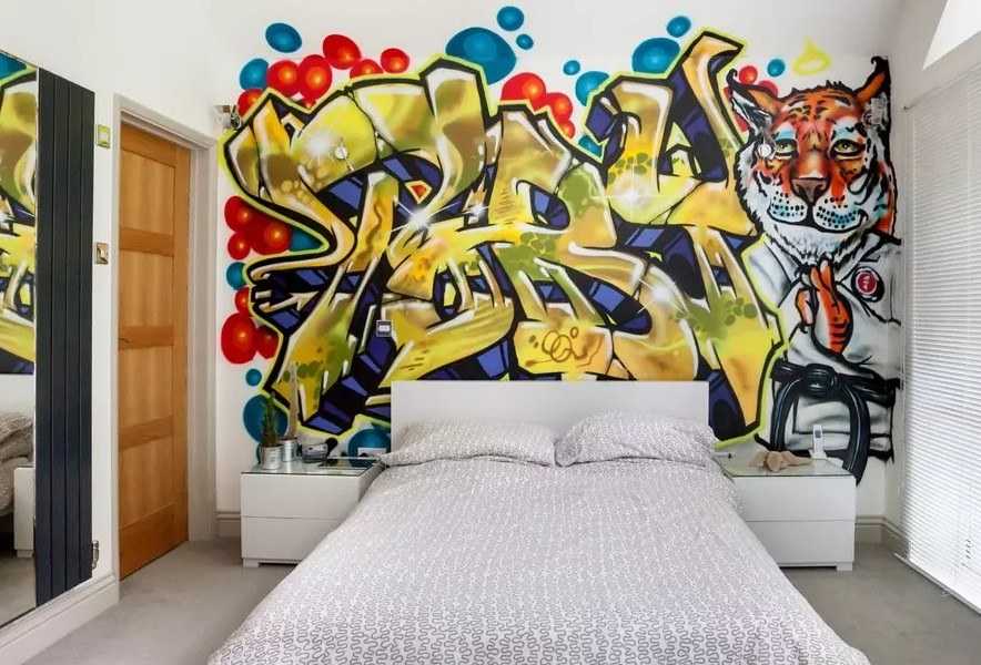 Благодаря широким возможностям колеровки такая роспись стен в интерьере может выглядеть абсолютно по-разному: от пастельных пейзажей, напоминающих фрески, до кислотных граффити.