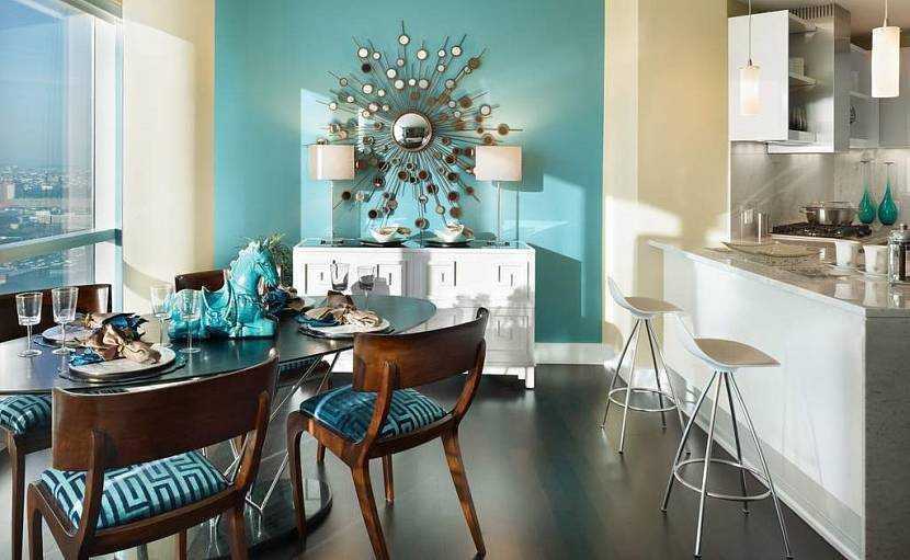 Однотонная бирюзовая стена на кухне с декоративными элементамиИсточник dizainkuhnibest.ru