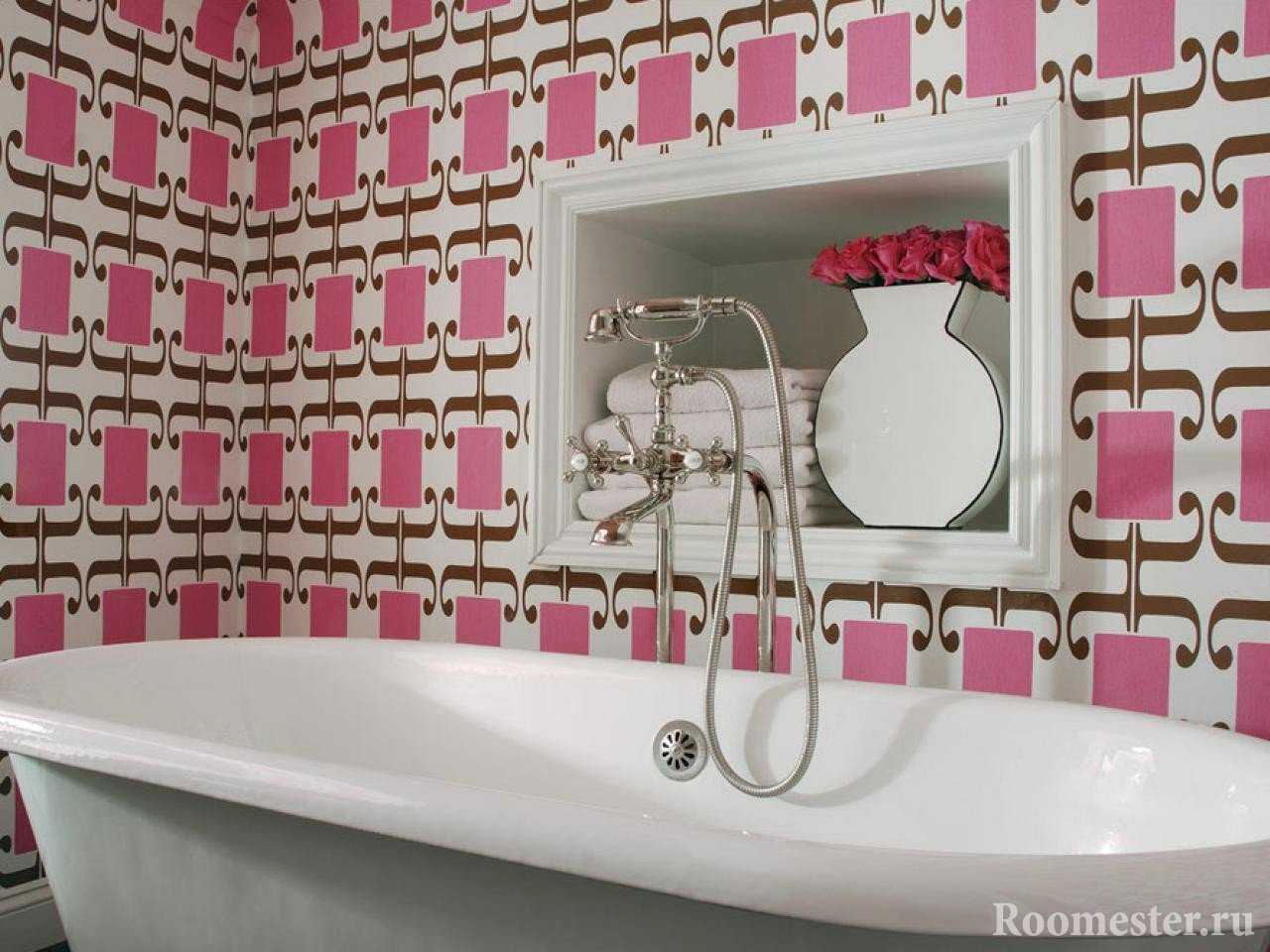 Обои с розовыми оттенками сделают интерьер ванной свежим и прохладным