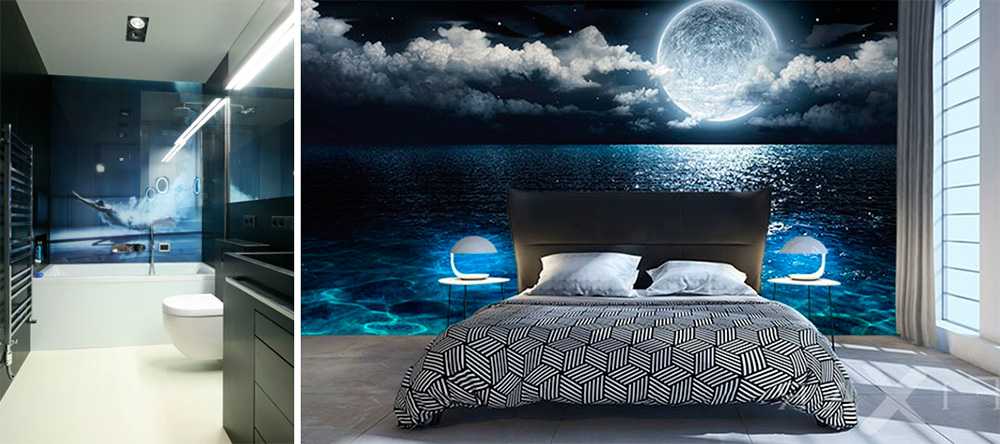 Эффектно выглядят фотообои, придающие интерьеру глубину, ощущение большего пространства. Особенно актуально решение в маленькой комнате, например, ванной.