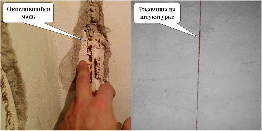 Вода вызывает ржавление, продукт окисления железа в виде бурых пятен проступает сквозь слой штукатурки, шпаклёвку, краску, обои, оказываясь на виду. Отделка испорчена. Потребуется ремонт с удалением профилей. Этот ремонт будет масштабнее и дороже, чем своевременное удаление маячков, поскольку пострадает вся отделка, находящаяся поверх планок.
