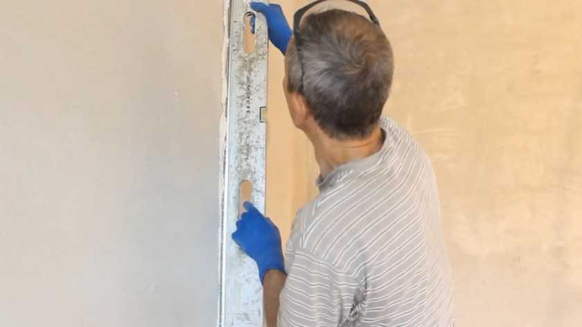 - При почти ровной стенке, когда местами имеются небольшие углубления, выравнивание ведут правилом, нанося состав шпателем.