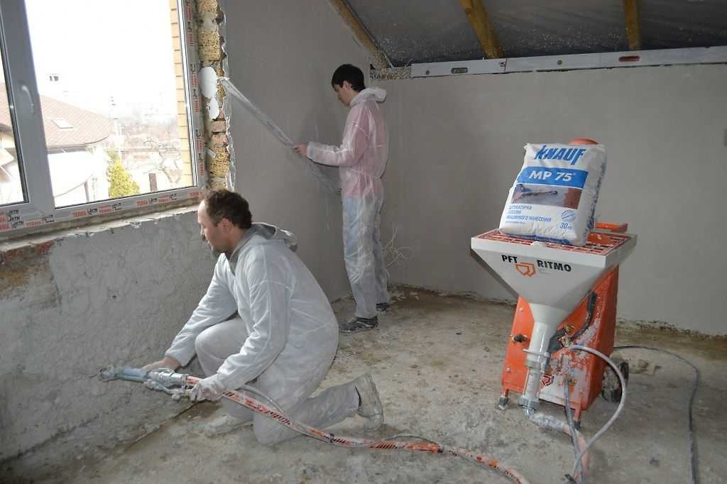 Этот агрегат пока далек от совершенства, его использование возможно только при работе со стенами, но не при нанесении раствора на фасад здания. В настоящее время эта машина завоевывает все большую популярность благодаря множеству плюсов ее работы.