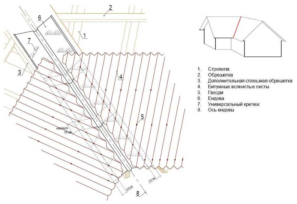 В заключение данной темы скажу несколько слов о ендовах. Как и прочие элементы крыши из ондулина, они монтируются несложно. Нижняя ендова укладывается на обрешетку в местах сопряжения кровельных плоскостей и прибивается гвоздями. После монтажа самого ондулина дополнительно, для красоты, можно установить и верхнюю, декоративную ендову – а можно и не устанавливать, так как на герметичность крыши она не влияет.