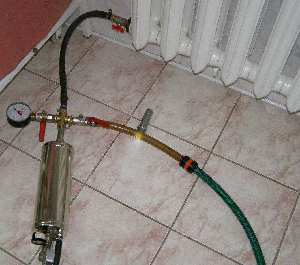 На окончания отопительных коммуникаций присоединяется специальное оборудование — пневмопистолет, при помощи которого в трубопровод подается пневмогидравлический импульс, отслаивающий налипшие на стенках труб и батарей загрязнители.