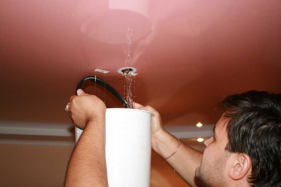 - Произвести демонтаж люстры или светильника, чтобы слить воду через образовавшееся отверстие. В случае их отсутствия демонтировать часть потолка, находящуюся поблизости к скоплению воды или сделать небольшой прокол.