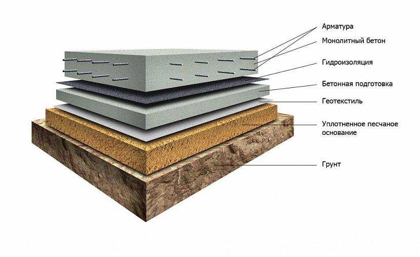 - монолитное. Представляет собой цельную бетонную плиту, армированную стальными прутками. Зарекомендовало себя в качестве надежной основы на плывунах или песчаных почвах;