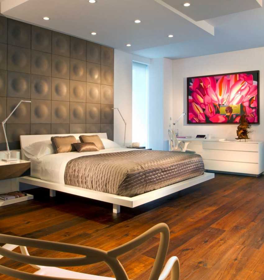 Теплота пола станет еще одним достоинством подобного украшения спальни. А хорошая звукоизоляция позволит оградить помещение от нежелательных шумов соседей с нижнего этажа.