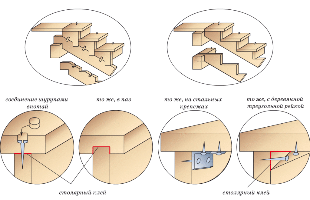 Монтаж лестницы из дерева возможен не только на цельном косоуре, на рисунке ниже представлен вариант сборки косоура с кобылками и вариант сборки тетивы.