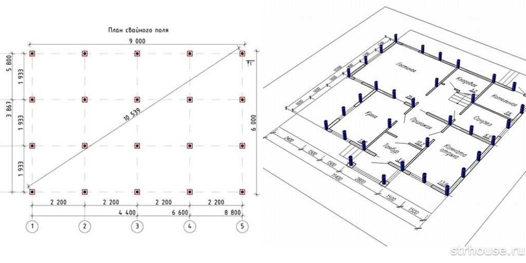 Строительство любого объекта начинается с разработки проекта, в котором необходимо отразить необходимое количество опор и места их установки. Свайные элементы необходимо устанавливать строго по разметке отдельными рядами в углах, местах пересечения стен и между ними.