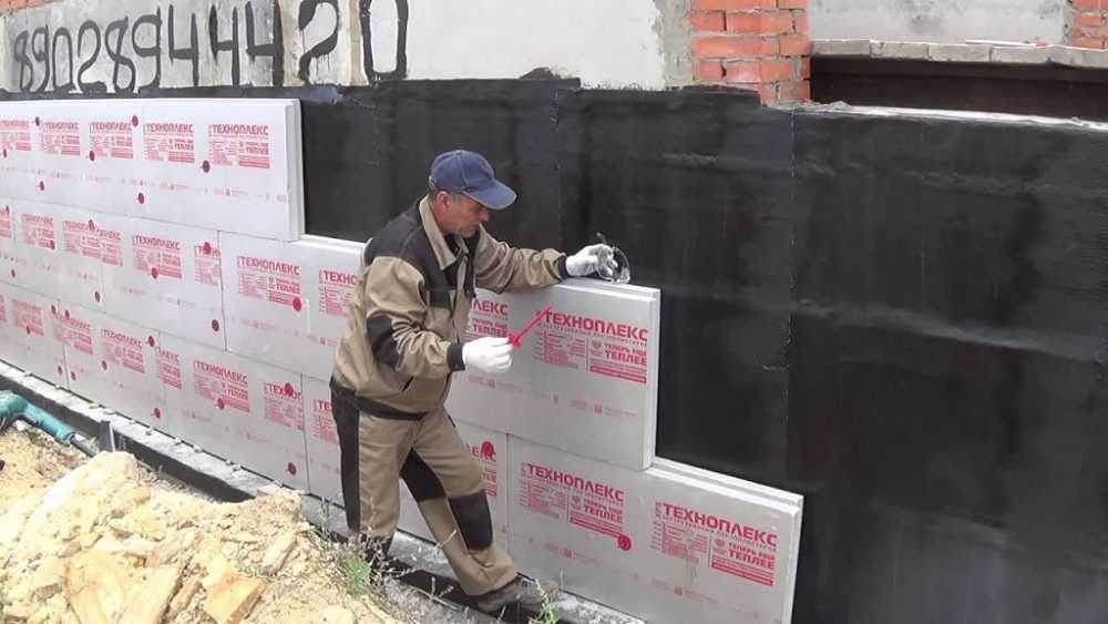 Сверху, обработанных и очищенных цокольных поверхностей, наносят гидроизоляцию. Непременным требованием является глубокое высыхание ее покрова. В противном случае плиты будут расползаться в стороны.