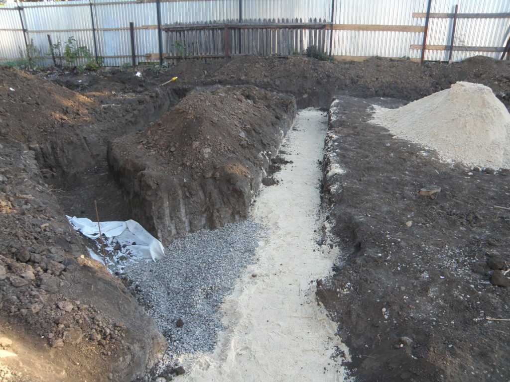Шаг 2. Подсыпка дна траншей ПГС, обустройство опалубки, армирование первого слоя – опорной части фундамента.