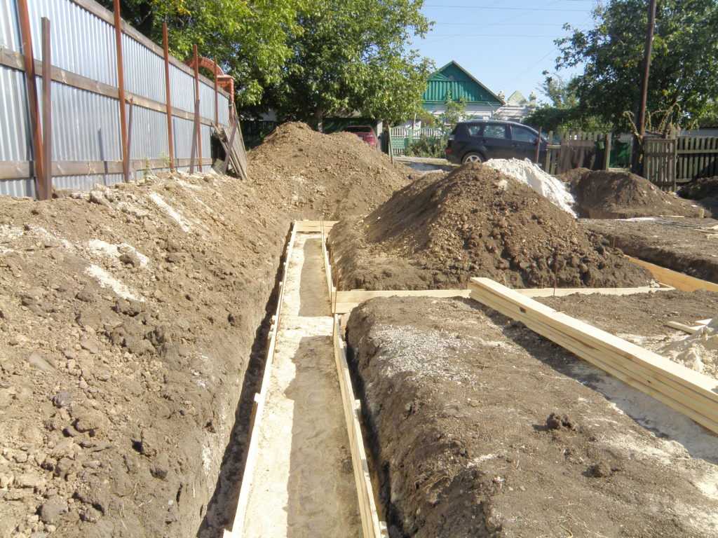 Далее, можно приступать к копке траншеи и выборки грунта. Копать можно как в ручную или используя эксковатор. После экскаваторных работ, дно и стороны траншеи необходимо будет ровнять вручную лопатой. Выбранный грунт сбрасывается за периметр фундамента или же частично во внутрь, если высота фундамента позволяет просыпать центральную часть.