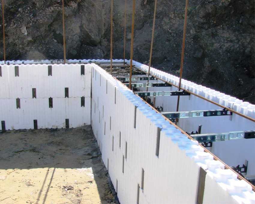 Стены, изготовленные с помощью такого метода, рекомендуется устанавливать на ленточный фундамент. Данная основа лучше всего подходит для строительства с использованием несъемных пенопластовых форм