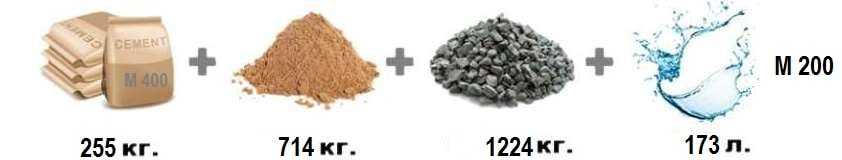 Для производства бетона разных марок потребуется различное количество составляющих компонентов. Для примера можно рассчитать состав бетона м200 на 1 м3. На 10 ведер цемента понадобится 35 ведер песка, а щебня 26 ведер. Воды понадобится 5 ведер. Зная плотность каждого вещества можно вычислить его вес в ведре.