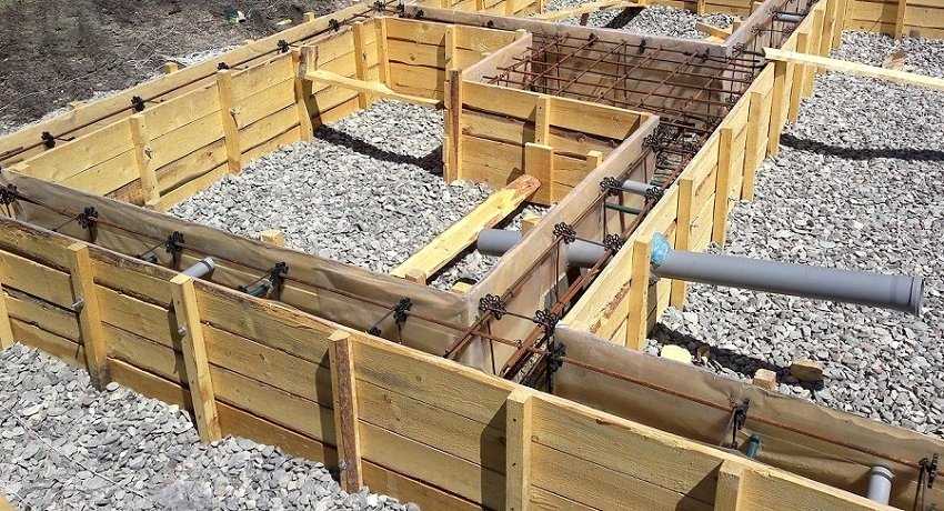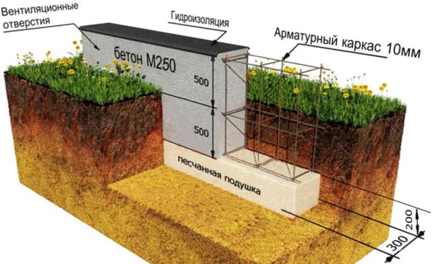 Связка должна быть замкнутой системой без разрывов с шагом крепления 10-20 см. После этого из обрезных досок 40х150-200 делается опалубка с распорками. После этого при помощи труб монтируют будущие отдушины. Затем в эту конструкцию заливают бетон. Причем высота опалубки должна быть не менее 30 см. Эта высота в дальнейшем будет высотой цоколя дома.