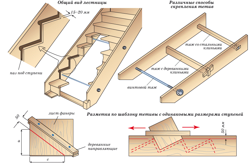 На приготовленных досках нужно отметить длину и отпилить лишнее. На бруске с помощью угольника размечают высоту подстепенка и ширину проступи с убавкой 2-4 см.