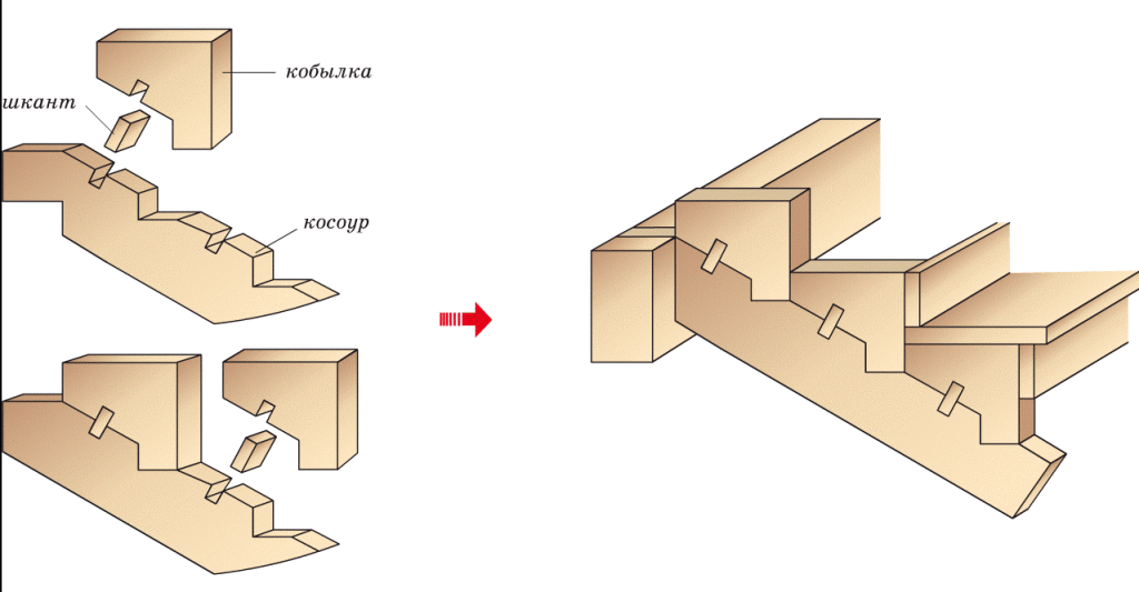 После фиксации подступенков устанавливаются заранее фрезерованные ступени, длина которых должна превышать расстояние между парой крайних косоуров на 1-2 см. Ширина элементов должна быть на 2-3 см больше гребеночного выступа. Крепление ступеней к подступенкам и косоурам осуществляется на саморезы, шляпки которых должны быть утоплены в дерево.