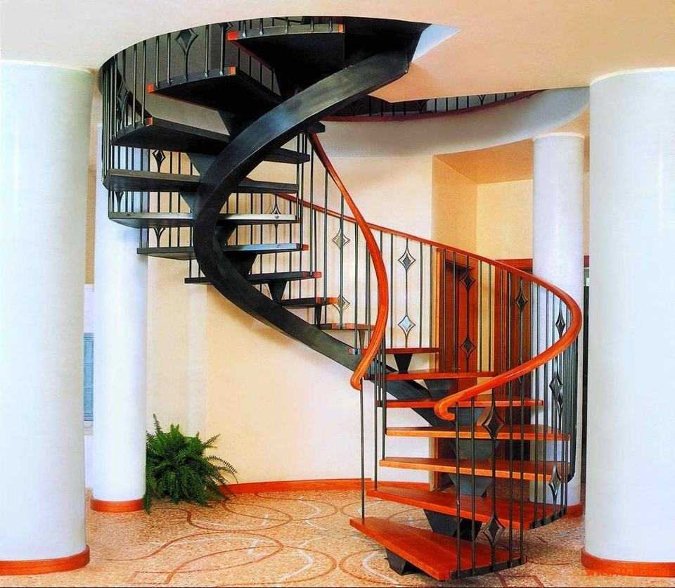 Это лучшие, самые изящные, сложнейшие в расчетах и конструировании лестницы, в которых использованы элементы трехмерной кривизны. Все ее ступени забежные, но центр окружности находится значительно дальше, чем у спиральной лестницы.