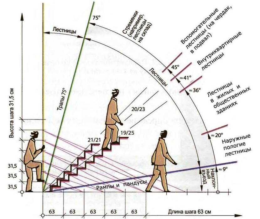 Углом наклона или крутизной лестницы определяется комфорт использования данного изделия. Крутая лестница занимает меньше места в помещении, пологая комфортна в эксплуатации. На схеме изображена зависимость комфортного передвижения по лестнице от угла наклона и места ее использования. В жилом помещении допускается угол наклона 20-45 градусов, но более комфортная зона на рисунке окрашена зеленым цветом (24-37 градусов).