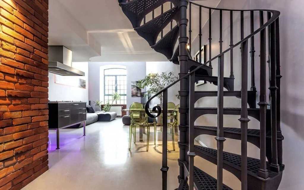Современный стиль лофт подразумевает минимализм. Никакой лишней мебели, никакого излишнего украшательства. Простой пример: стены покрашены в белый цвет, в то время как лестница с этажа на этаж оформлена перилами со стеклянными экранами и металлическими коваными элементами. В данной стилистике рисунок кованых элементов должен быть простым, состоящим из прямых элементов.