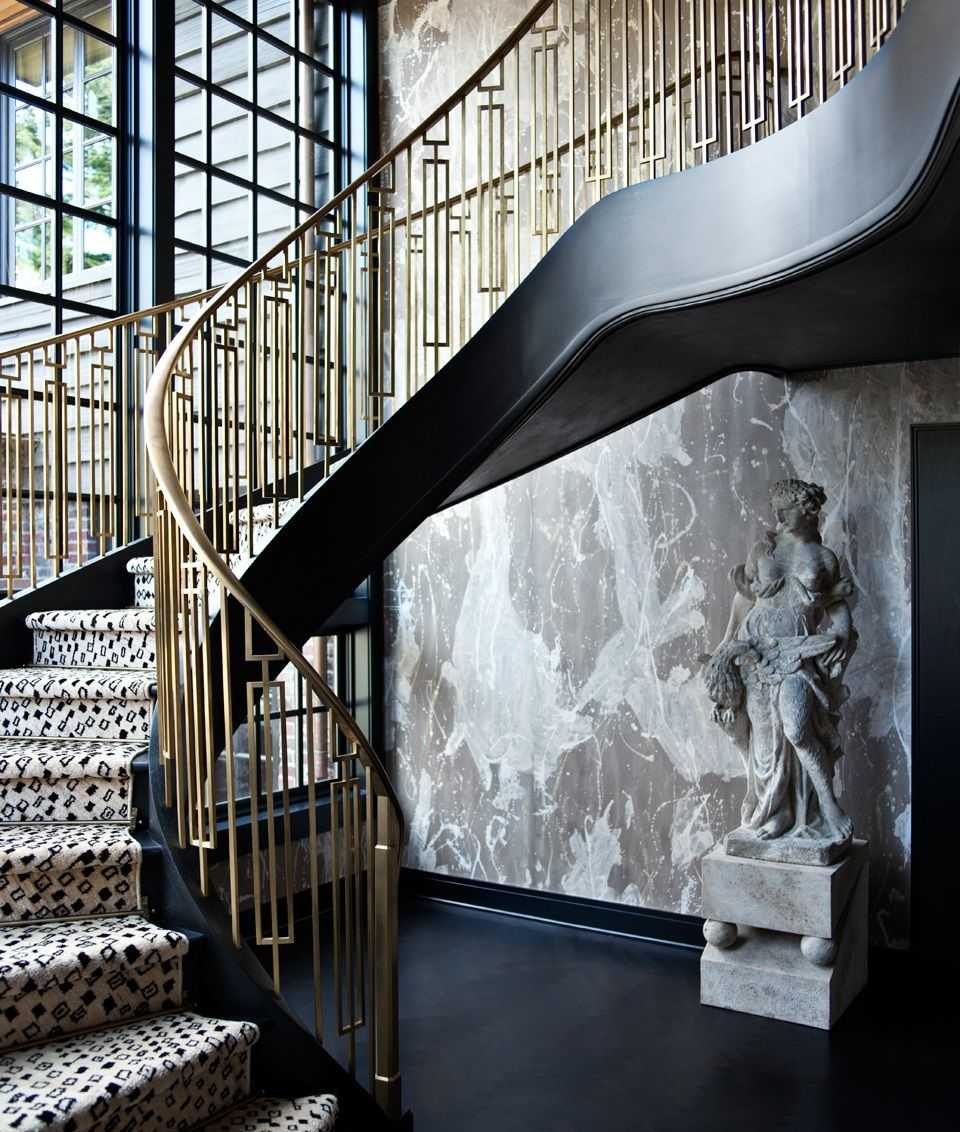Рококо. Дизайн интерьера в этом стиле выглядит декоративно с художественными элементами. Все линии должны быть плавными, с изгибами. Лестничные перила повторяют эту идею и напоминают изящное кружевное полотно с патиной. Вся поверхность этого полотна заполнена цветами, птицами и листьями.