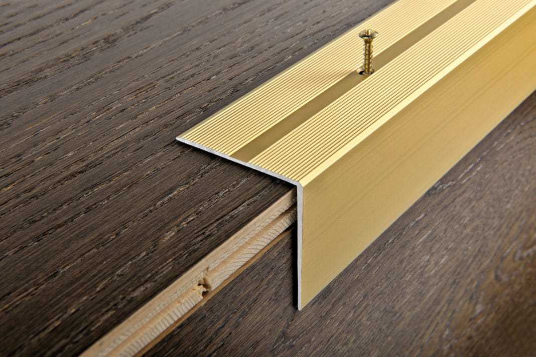 При отделке лестницы ламинатом, для декорирования и защиты от повреждений внешних углов ступеней, используются специальные накладные уголки. Эти изделия также могут называться молдингами или краевыми порожками. Монтаж такой детали обшивки осуществляется на клей или при помощи саморезов.