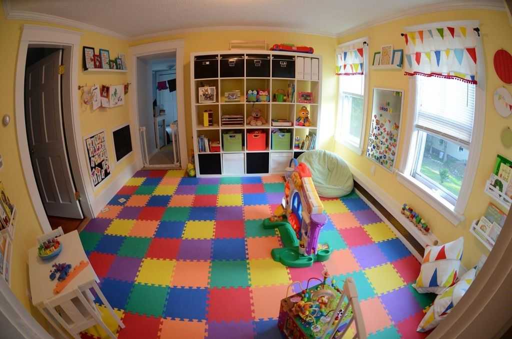 Иногда пол выкладывают паркетом или имитацией под дерево, затем сверху накрывают модульным полимером. Безопасным покрытием является ковролин: мягкий, теплый, не требует щепетильного ухода материал.