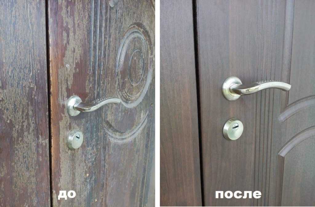 Внешняя сторона входной двери квартиры, расположенная со стороны подъезда, может подвергаться различным физическим воздействиям. Например, поверхность дверного полотна может быть повреждена соседями при неаккуратной переноске крупногабаритного бытового оборудования, мебели, сантехники и прочих предметов. Часто покрытие портится в результате трения об него связки ключей или воздействия влаги.