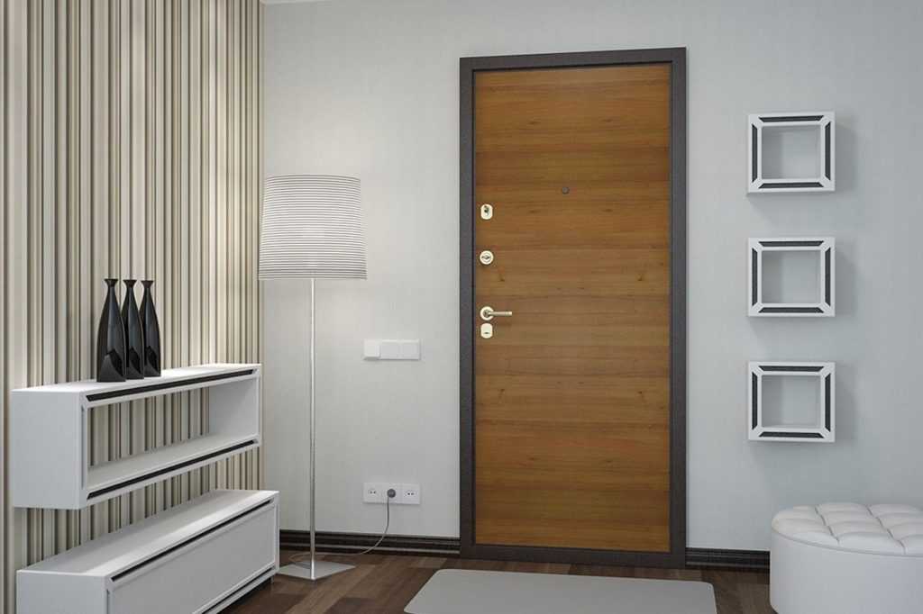 За неимением внутренней (второй) двери в квартиру, можно отделать входную дверь ламинированными панелями из МДФ. Это внесет в помещение уют, одновременно позволив гармонично сочетать входную конструкцию, которая зачастую не отличается изысканностью, с интерьером прихожей.