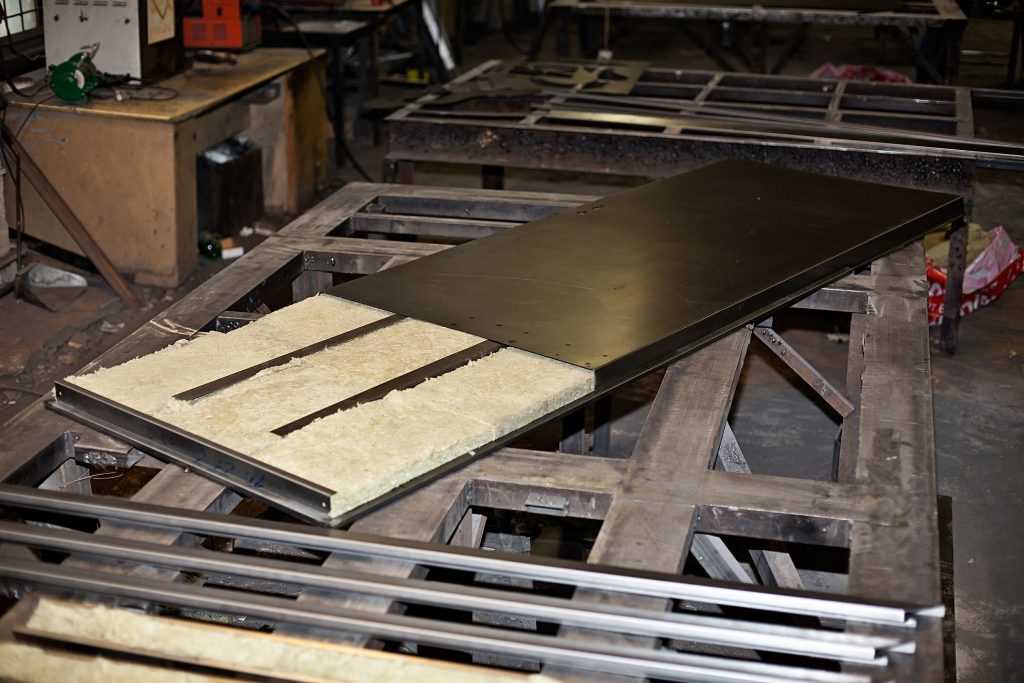 То есть отделочный материал предварительно фиксируется к дверному полотну с помощью струбцин. Затем изнутри конструкции вкручиваются саморезы через предварительно сделанные отверстия в металлическом листе полотна. Далее на место укладывается утеплительный материал и закрепляется вторая сторона дверной створки.