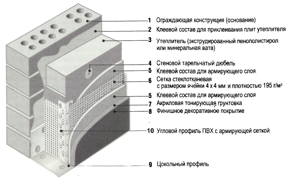 - финишной отделки, несущей декоративный смысл и защищающей снаружи всю систему от атмосферных явлений.