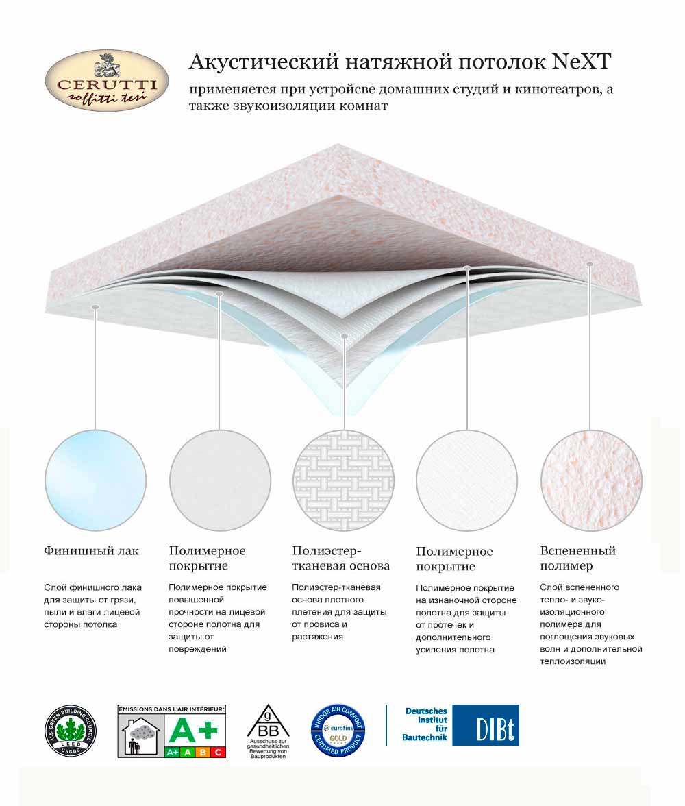 Если же главным критерием при выборе покрытия является шумоизоляция, то вашему вниманию предлагается такой вид полотна как Cerutti Next. Особый состав слоев такого полотна обеспечивает максимальный барьер на пути любых звуков. Опыт эксплуатации потолков из такого полотна показал, что оно способно изолировать от самых громких нежеланных звуков.