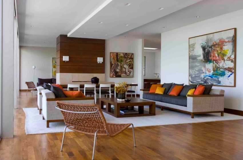 Задача комбинированной отделки гармонично ввести в атмосферу игру цветов и фактур, наполнить ее уютом и акцентировать внимание на определенной зоне. Например, из деревянных панелей может быть создано некое подобие острова, нависающего над центральным элементом обстановки