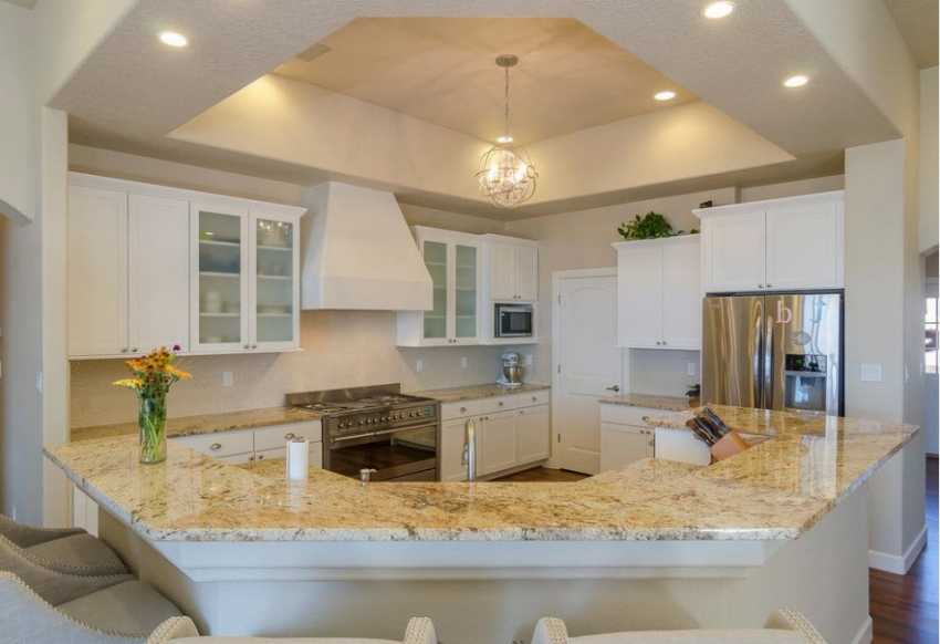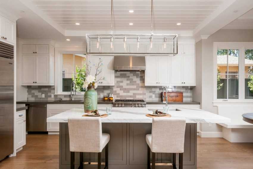 Например, если есть необходимость сделать навесной потолок на кухне, площадь которой позволяет вместить зону для приготовления еды, а также столовую. В этом случае разделение может быть достигнуто за счет размещения потолочного покрытия на разных уровнях, некоторых цветовых решений, а также специфики расположения освещения.
