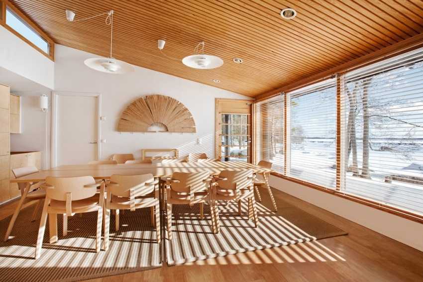 Навесные потолки хорошо сочетаются с деревом. Так, в деревянном доме можно создать интересный и современный стиль. Пример вы можете посмотреть на фотографии