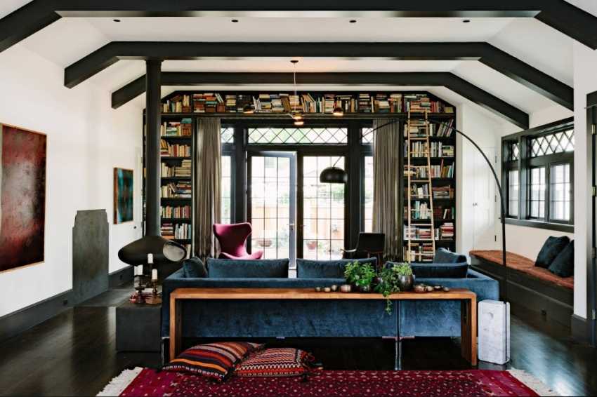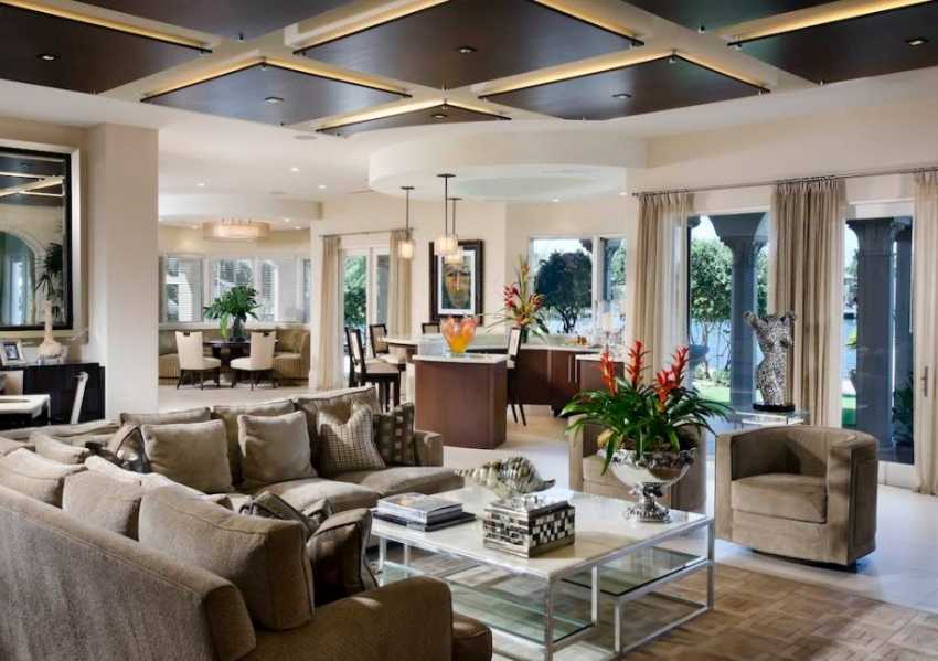 В спальне таким акцентом будет кровать, в гостиной в этой роли вполне успешно выступит роскошный диван или целый участок пространства, во главе с камином.