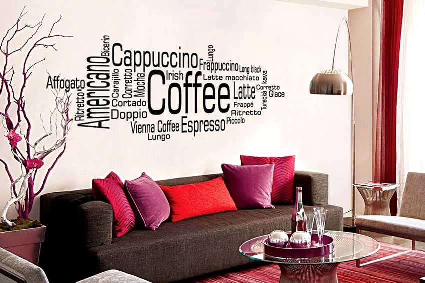 Кухня — идеальное пространство для дизайна с надписями. Здесь можно использовать любые текстовые варианты: диванные подушки-буквы, грифельные доски для записей, наклейки на фартуке и фасадах гарнитура, тематические постеры на стенах. Большой популярностью пользуются обои со словом Coffee или объемная фраза «Bon Appétit» из дерева. Также можно сделать оригинальные подписи на банках с крупами.