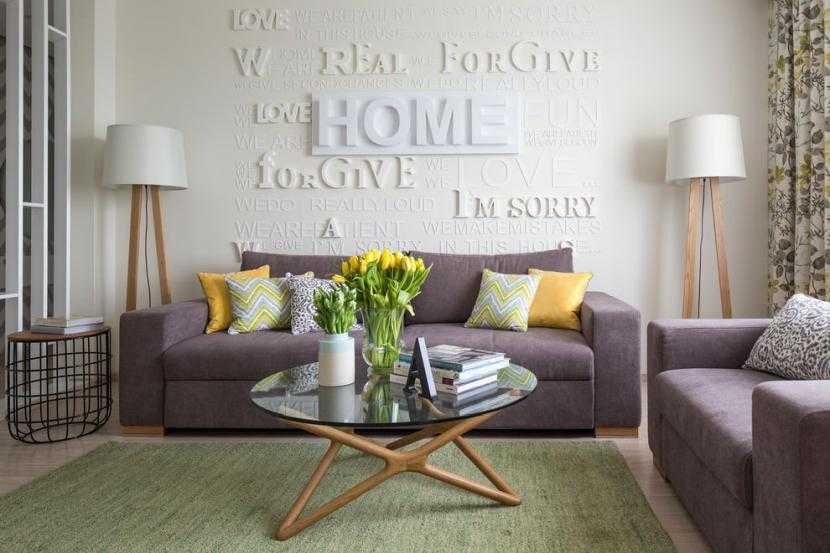 Гостиная. Место отдыха семьи можно украсить любыми вариантами декора. В классическом интерьере к месту будут картины с надписями; в интерьер, оформленный в современном стиле, впишутся фразы или отдельные слова (например, «дом»).