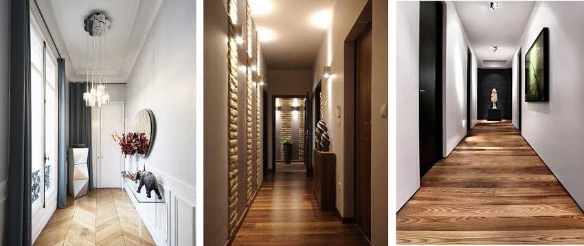 - Маленькое помещение узкой формы визуально увеличит диагональная укладка доски или ламината. Исправит пропорции коридора паркет с раскладкой «елочка», мелкий рисунок, а также однотонный пол;