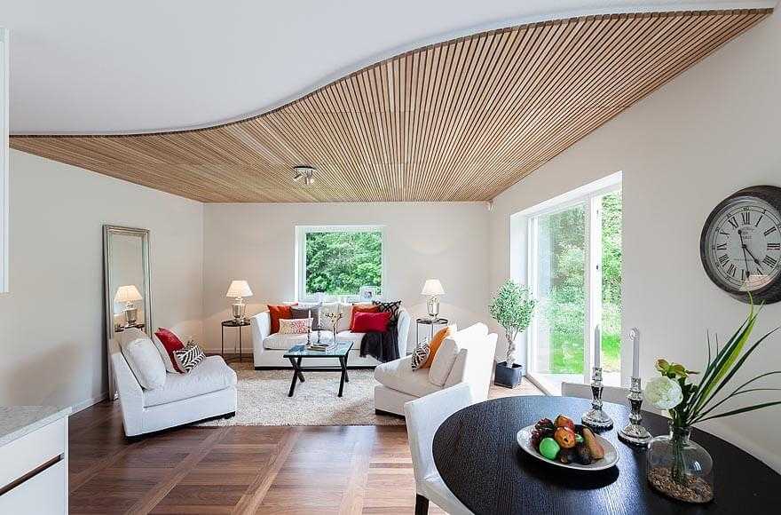 Потолочное покрытие частного дома имеет больше вариантов дизайна, поскольку здесь присутствуют и значительная высота стен, и достаточная площадь помещения.