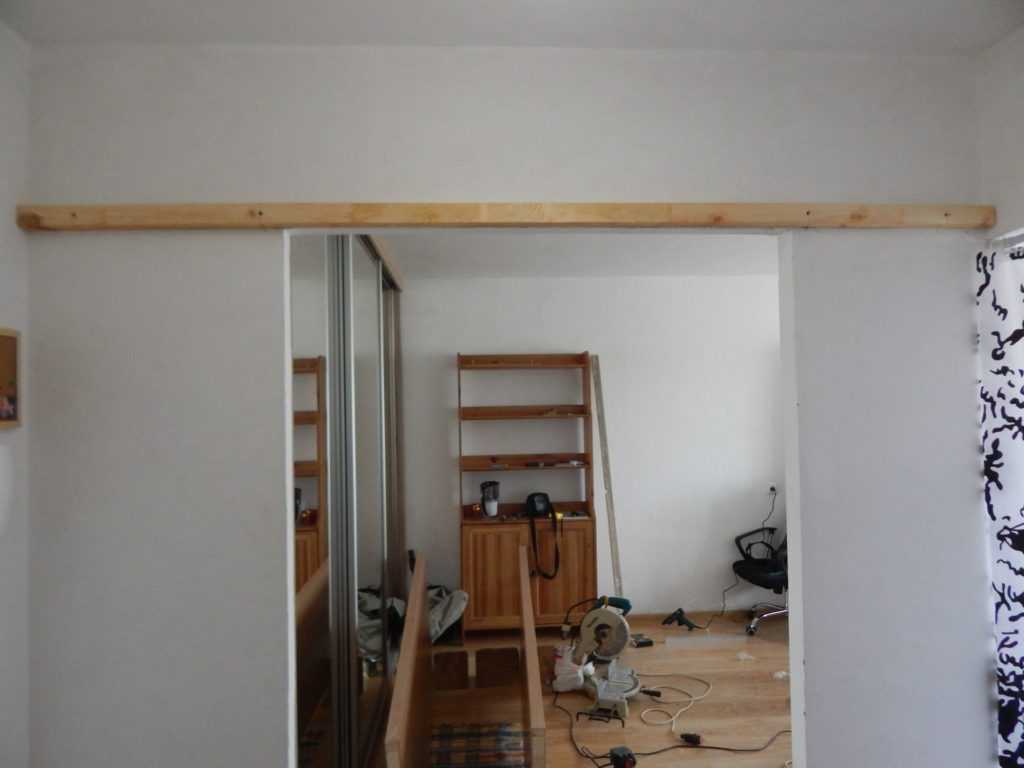 Закреплять верхнюю направляющую можно кронштейнами, однако когда раздвижные межкомнатные двери являются весьма массивными, то установка верхней направляющей производится при помощи деревянного бруса, который следует прикрепить к стене, а уже к нему прикрепить направляющую.