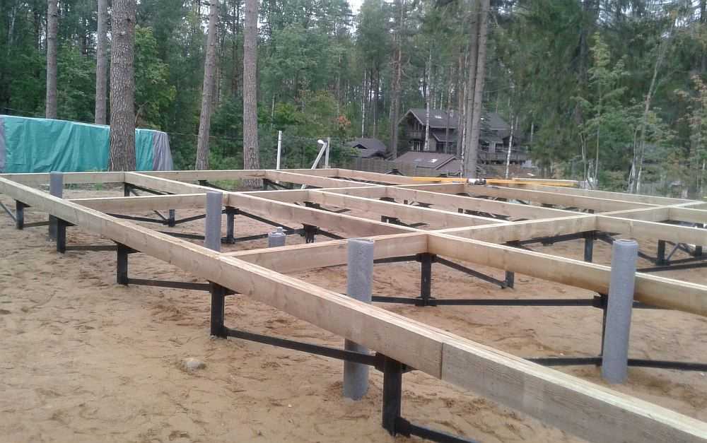 Перед устройством вертикальных конструкций формируется ленточный, свайный либо столбчатый фундамент. Подобное основание хорошо справляется с легковесными зданиями. Поверх готовой опоры обустраивается обвязка. Для этого можно использовать деревянный брус либо усиленный металлопрофиль. Как правило, предпочтение отдается первому. Под него обязательно прокладывается гидроизоляционное полотно.