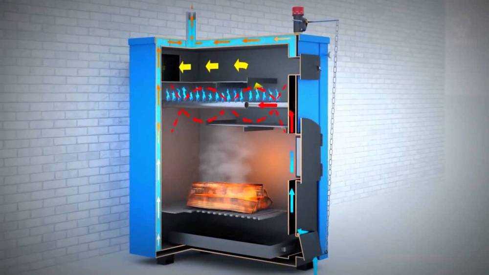 Однако КПД таких котлов ниже, потому что дым уходит из камеры быстрее, температура его выше, в результате он успевает отдать меньше тепла. Основной принцип работы газогенераторного котла всегда остается неизменным, даже при смене места расположения камеры сгорания.