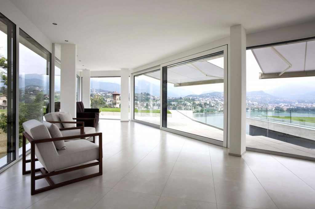 Дома с панорамными окнами выглядят современно и стильно. Однако главная особенность — получение большего количество солнечного света по сравнению с конструкциями со стандартными проемами. Обычно панорамными делается часть окон. Чаще всего так остекляют гостиные. Данный вариант используется также для обустройства террас закрытого типа и веранд. Остекление до самого пола обеспечивает прекрасный панорамный вид. В многоквартирных постройках окна в пол делают только на балконах и лоджиях, гораздо реже — где-либо еще. Остекление всего горизонтального пространства требует скрупулезных расчетов и грамотного дизайнерского решения. Обязательно понадобятся крепкие вертикальные опоры для стен и кровли. Стандартные готовые проекты домов редко содержат нужные расчеты. На проектирование, изготовление и монтаж потребуется потратить крупную сумму.