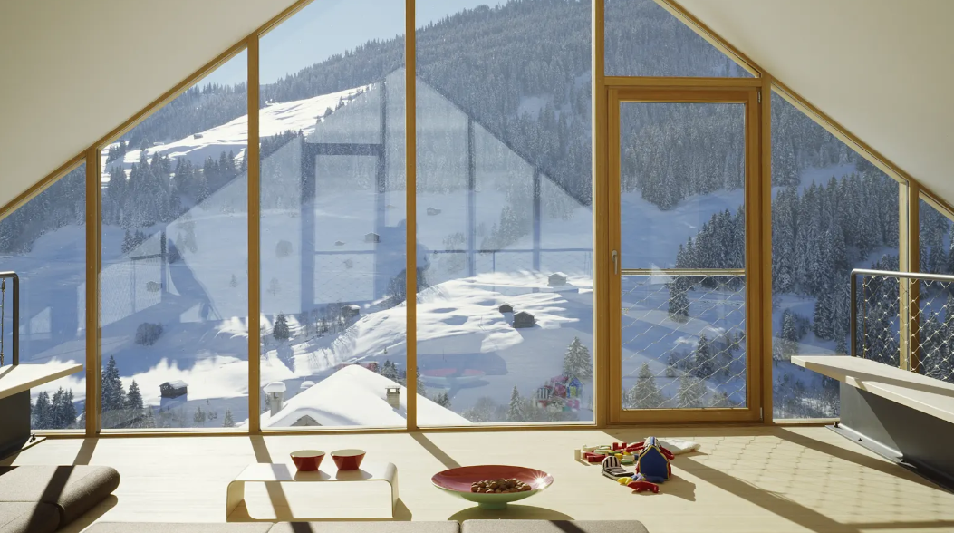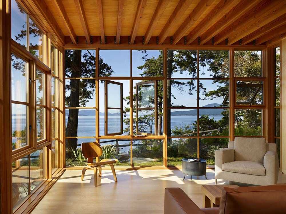 Недавно дизайнеры предложили оригинальный конструктивный прием, когда два больших окна соединяются друг с другом под прямым углом. Если они окажутся достаточно большими, то грань между помещением и улицей практически полностью стирается и создается впечатление наличия портала в природу.