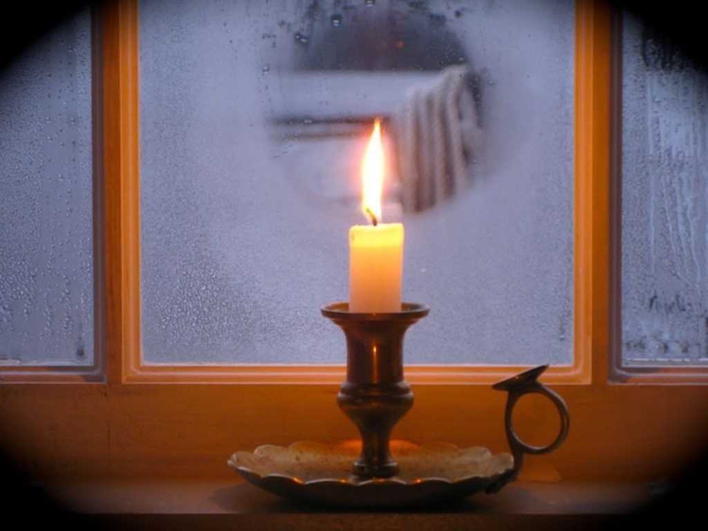 Зажигание стеариновых свечей на подоконнике потеющего окна.