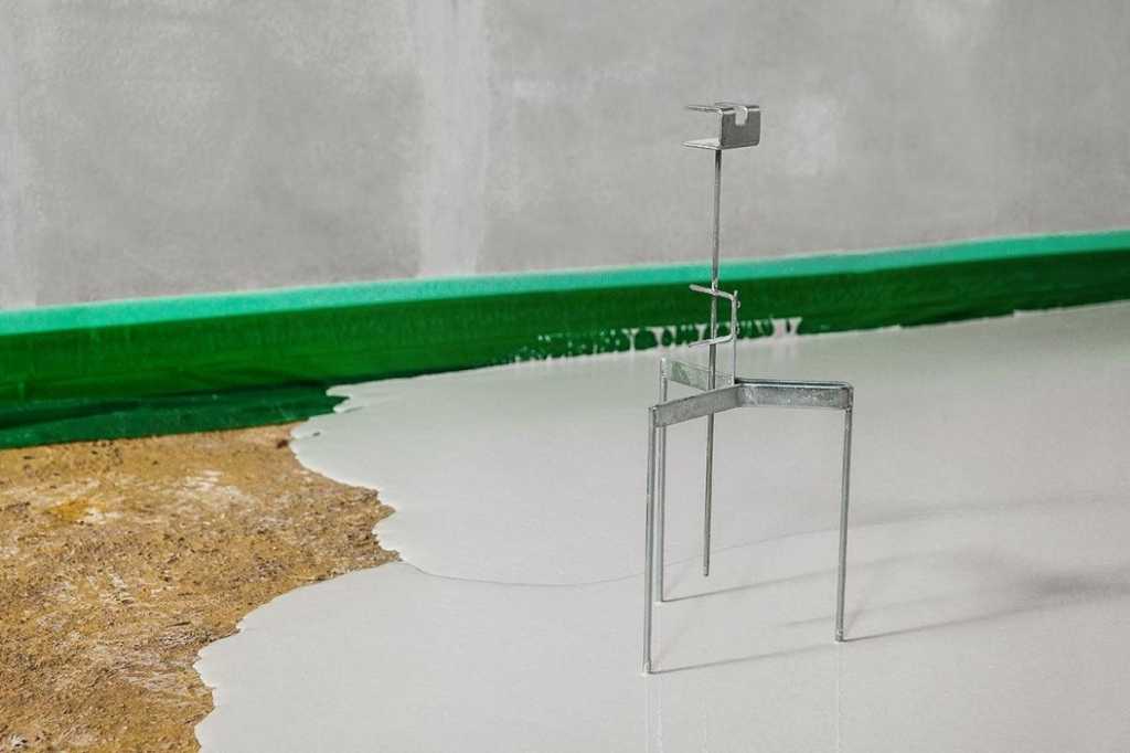 Маячки-реперы устанавливаются так, чтобы высота нижнего края регулируемого штыря в центре совпадала с требуемым уровнем заливки. Элементы расставляются по рабочей поверхности с шагом в 150-200 см. Высота установки проверяется лазерным или строительным уровнем.