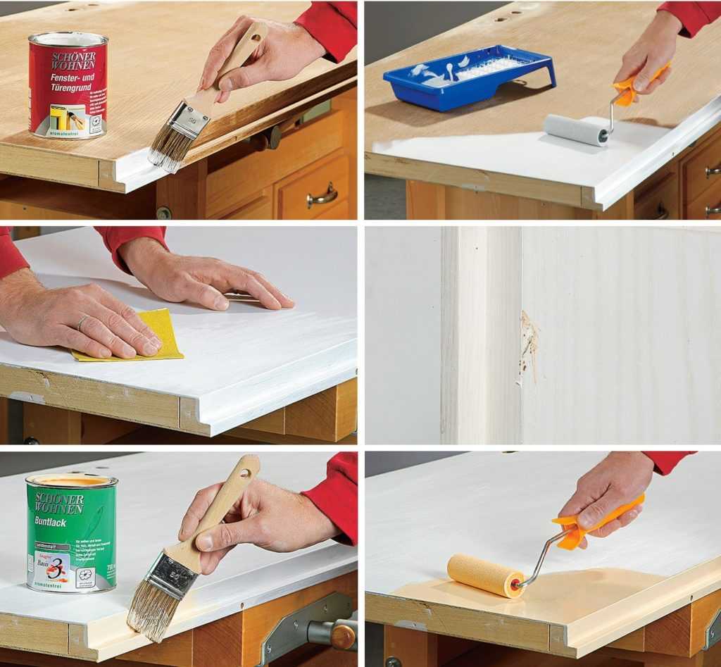 Для этого лучше использовать лак, но только с оттенком. Краску использовать поверх старого лака не рекомендуется — она не будет приставать. Поэтому для покраски необходимо снять старое лаковое покрытие.